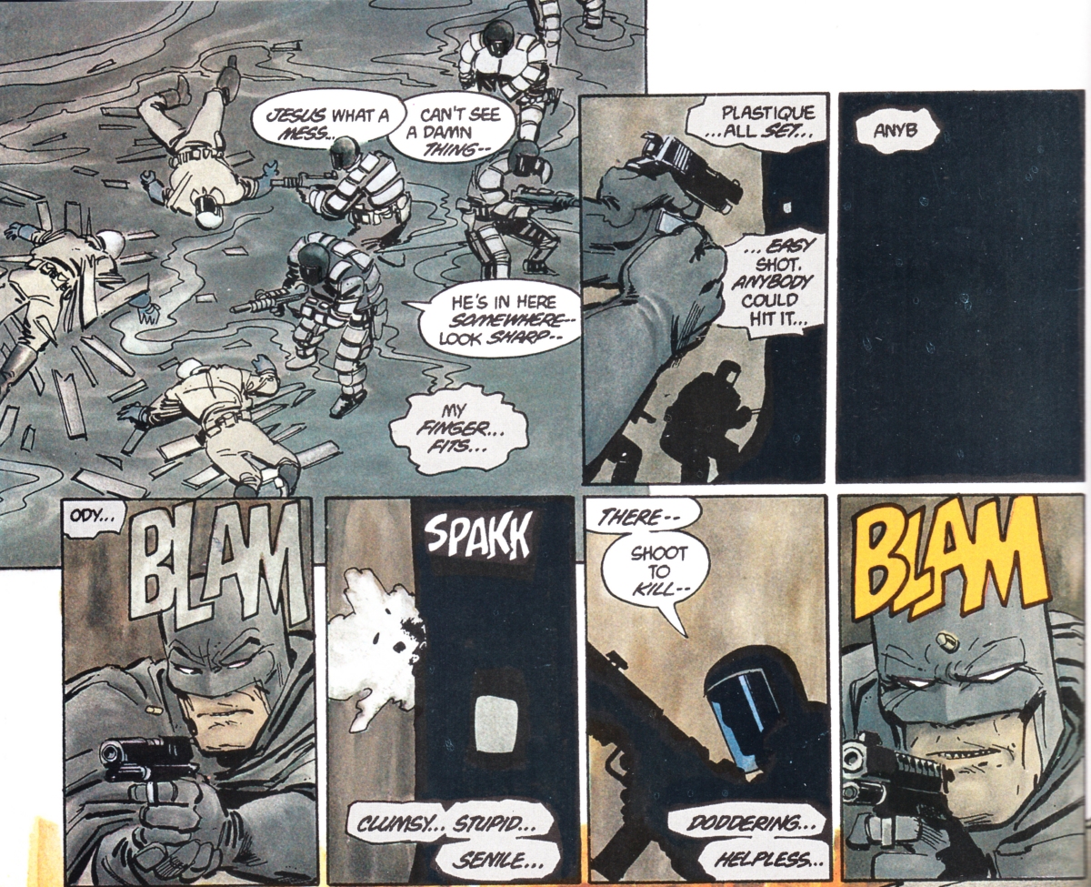 In the prior two decades leading up to this book, the main pop culture mental image of Batman was of Adam West’s do-gooder Caped Crusader from the campy 1960s TV series. Even most of the comics and cartoons in those years had drifted pretty far from the original noir-ish conception he started as in the 1940s, and instead portrayed Batman as a wholesome boy scout who only fought crime from within the confines of the law. Frank Miller wasn’t having any of that. In his revisionist take on the character, Batman became a brooding, tormented vigilante who took the law into his own hands and used brutal tactics to purge Gotham of crime by any means just short of murder, at which he barely drew a line.