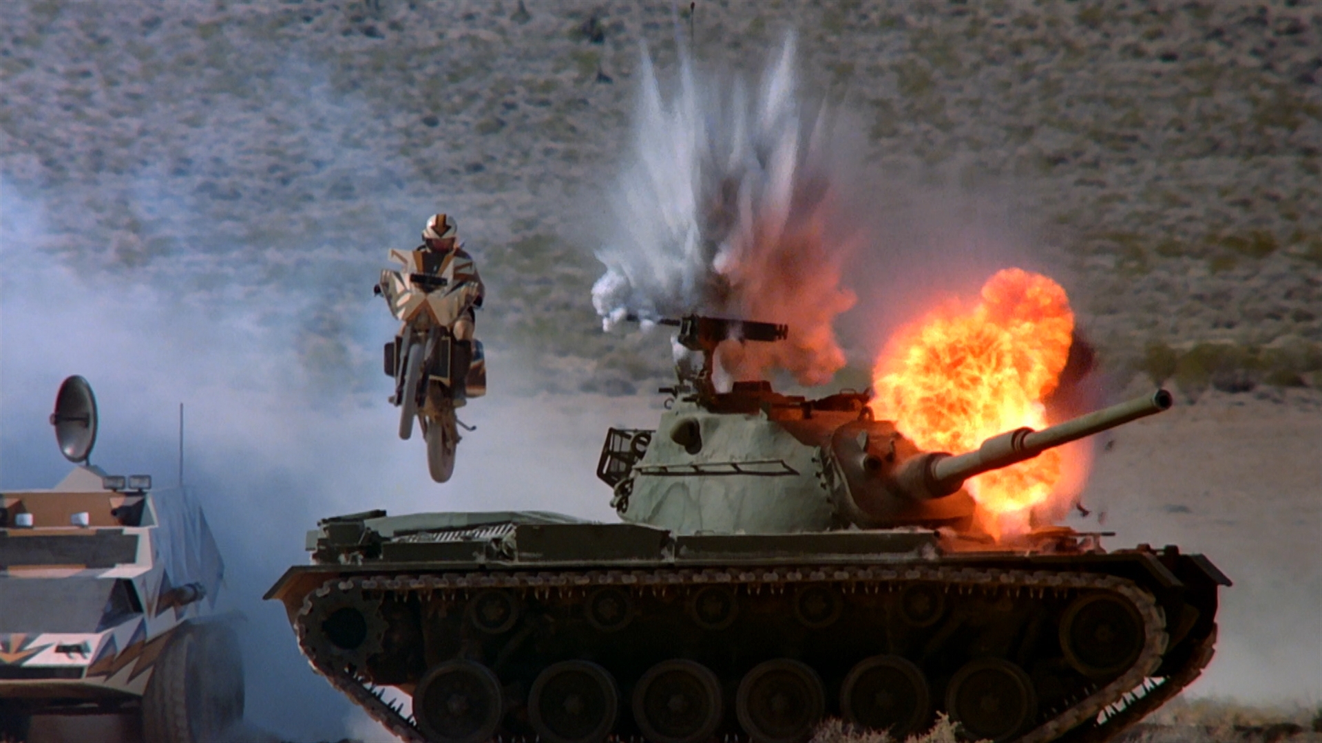 Even the vehicular action – Needham’s specialty – is disappointingly dull. The battle scenes are confusingly choreographed and highly repetitive. The director attempts to make up for his lack of inventiveness with a large  volume of buggies and dirtbikes driving around in circles and firing a conveniently never-ending supply of rockets. The stunts are of about the same quality you’d see on TV shows like The Dukes of Hazzard, The Fall Guy, or Knight Rider at the time. (The A-Team was less than a year away as well.) Nothing about Megaforce felt worth the price of a movie theater ticket.