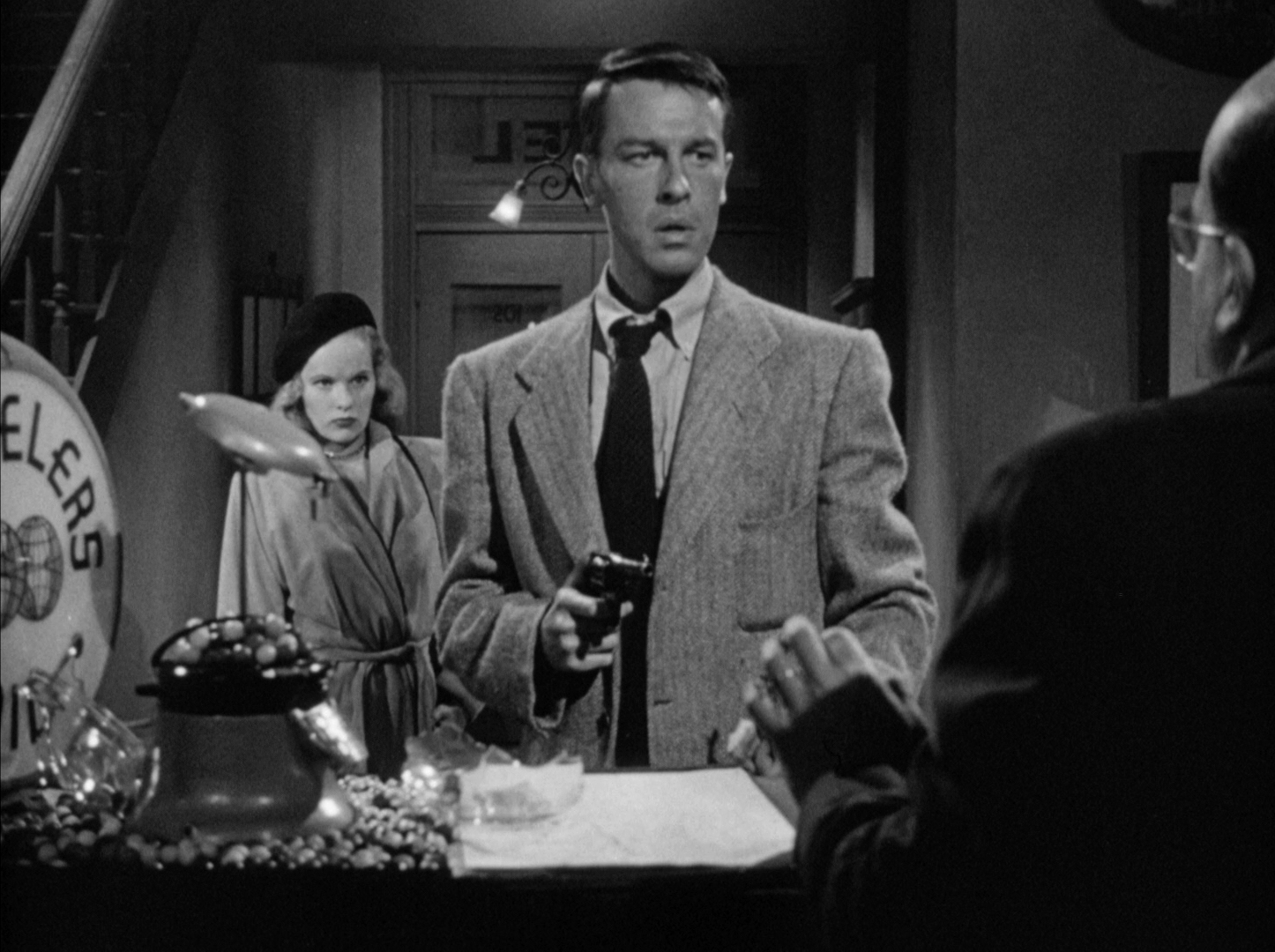 In many respects, Laurie is a classic femme fatale, and Bart the gullible sap who falls for her wicked ways. Their relationship follows the basic structure set up by countless noir pictures throughout the 1930s and ’40s leading up to this one. Even that being the case, Bart here is no blameless victim. He falls for Laurie hard and willingly goes along with her plans, putting up little objection. Clearly, he’s blinded by love, but even more than that, he’s blinded by his own need to feel important and useful, and the only way he knows how to do that is to use a gun.